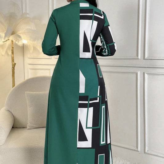 Ladies' Round Neck Printed Waist Cinching Slimming And Hip Hugging Dress