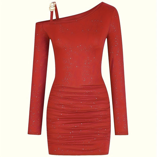 Ladies' Off Shoulder Sexy Solid Color Glossy Tight Fitting Dress