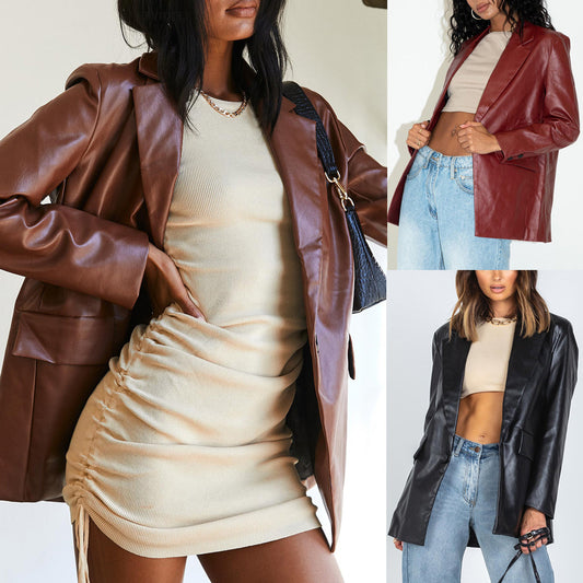 Women's Fashionable Temperament Long Knee Length PU Leather Coat